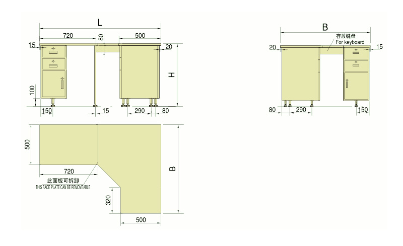 右式电脑桌(LY150型),左式(LZ150型)与此对称